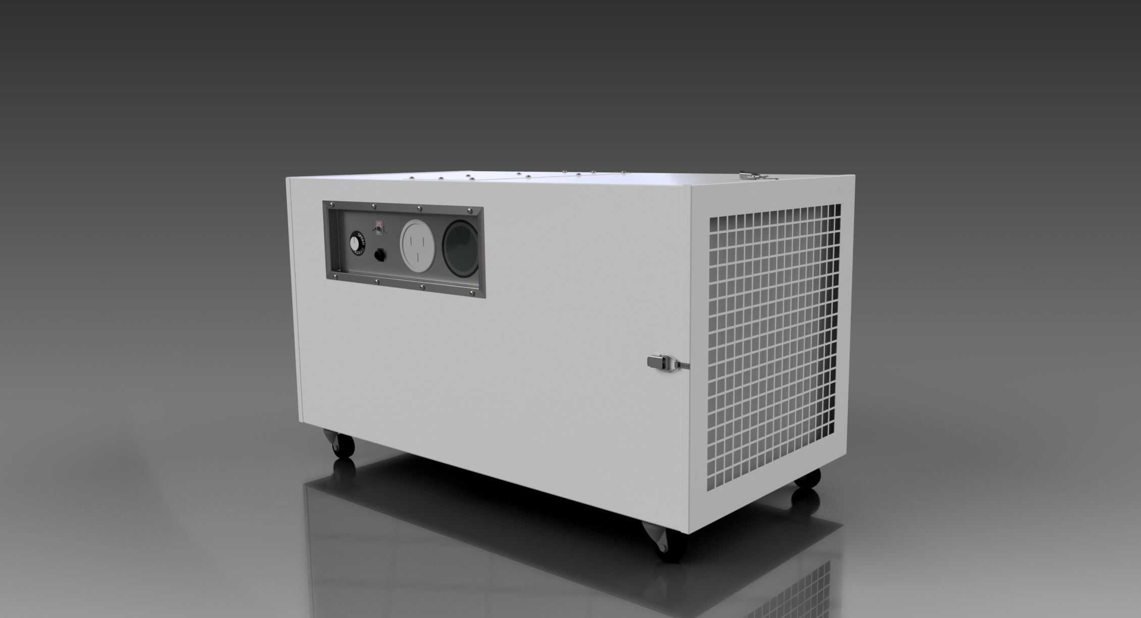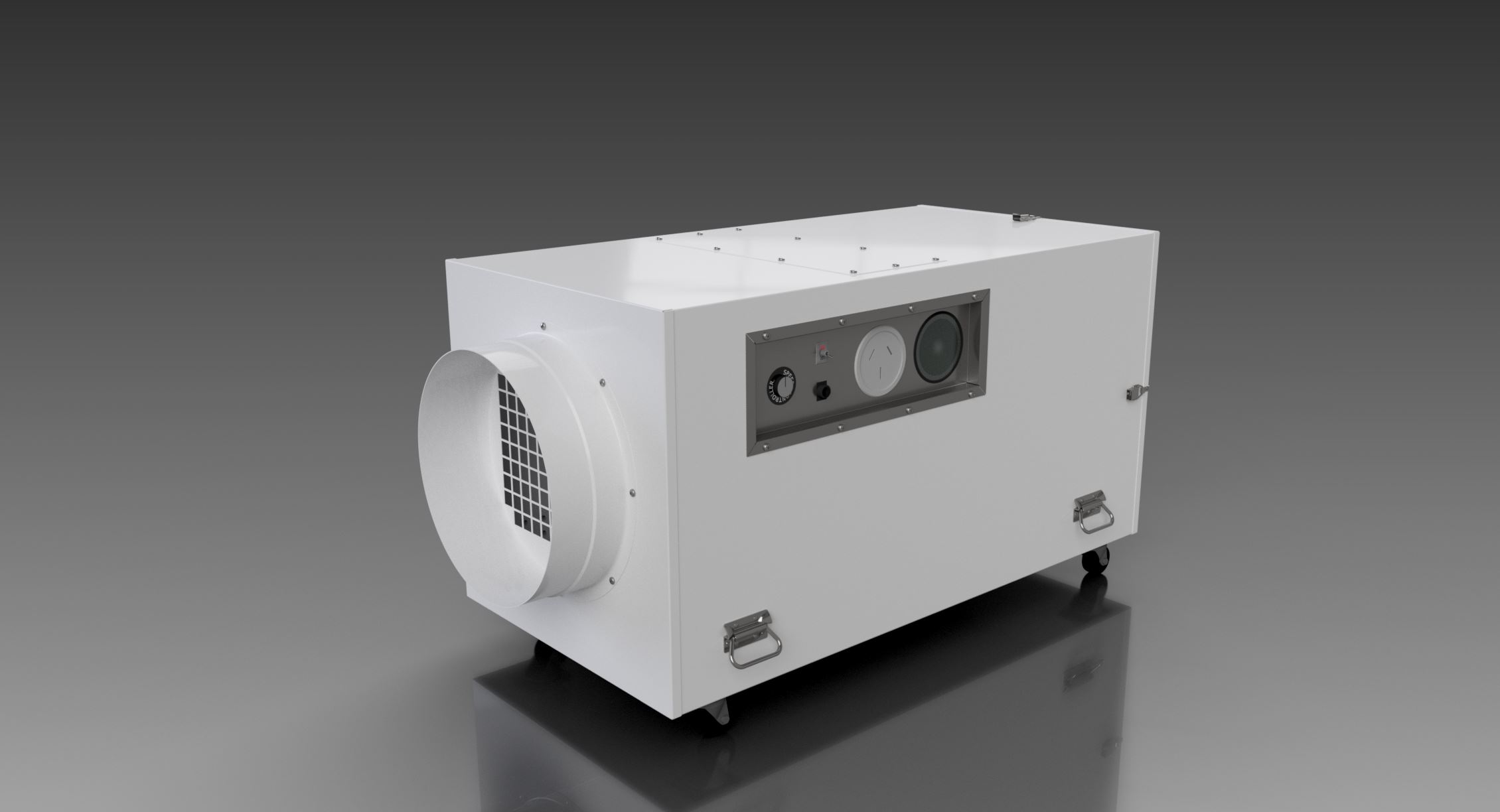 The Portable Pollution Control system is supplied with wheels in order to facilitate ease of relocation. Wheel locaters are also attached to the unit to enable them to be stacked safely. Fan speed controller and a 240-volt power socket (for connection to mains via extension lead) are also fitted as standard items.